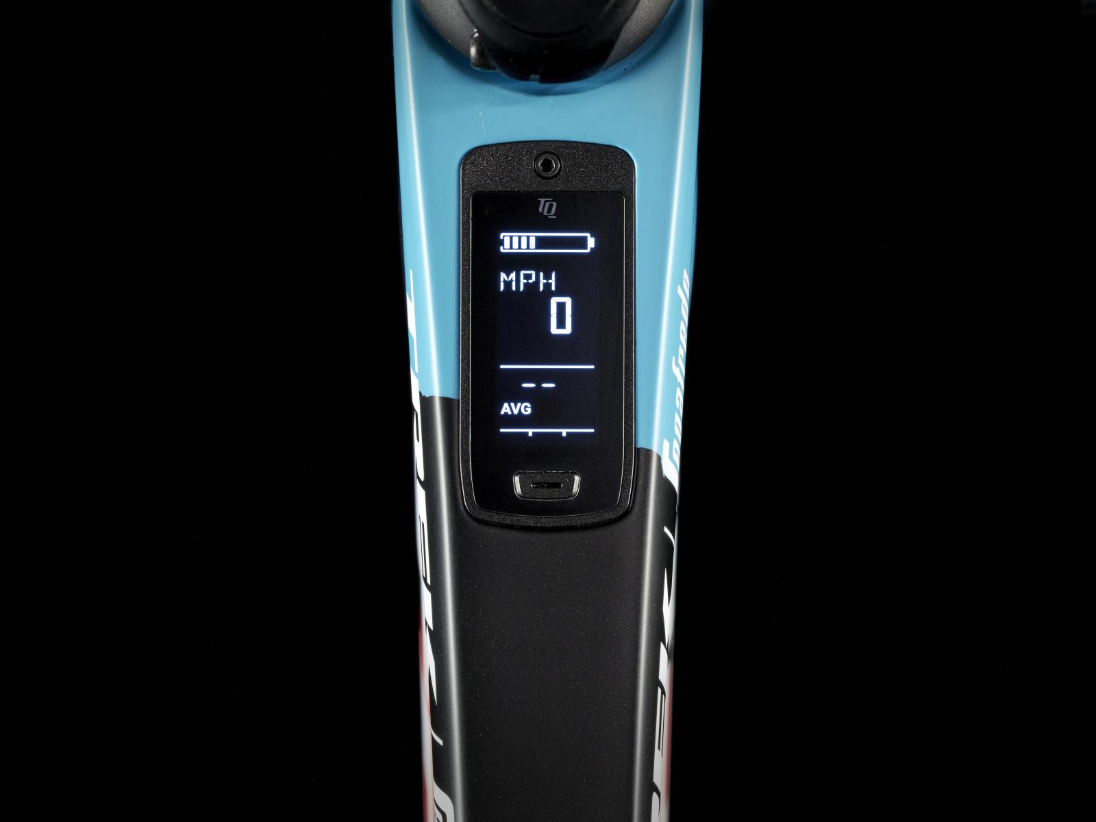Einen äußerst leichten Rahmen aus 800 Series OCLV Carbon mit hinterem IsoSpeed. Einen kraftvollen Harmonic Pinring-Motor von TQ mit einem Drehmoment von 50 Nm, der dich bis zu einer Geschwindigkeit von 25 km/h unterstützt, einen 360 Wh großen integrierten Akku, ein in den Rahmen integriertes, smartes LED-Display und diskret in die Bremsgriffgummis verbaute Bedienelemente für das Umschalten der Unterstützungsmodi. Aeolus Pro 37-Laufräder aus OCLV Carbon, eine drahtlose, elektronische Shimano Ultegra Di2 2x12-Schaltung, eine Carbonkurbelgarnitur, ein vibrationsdämpfender Bontrager Pro IsoCore-Lenker und ein RCS Pro-Vorbau mit voll
