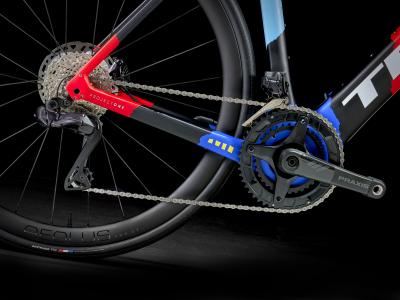 Einen äußerst leichten Rahmen aus 800 Series OCLV Carbon mit hinterem IsoSpeed. Einen kraftvollen Harmonic Pinring-Motor von TQ mit einem Drehmoment von 50 Nm, der dich bis zu einer Geschwindigkeit von 25 km/h unterstützt, einen 360 Wh großen integrierten Akku, ein in den Rahmen integriertes, smartes LED-Display und diskret in die Bremsgriffgummis verbaute Bedienelemente für das Umschalten der Unterstützungsmodi. Aeolus Pro 37-Laufräder aus OCLV Carbon, eine drahtlose, elektronische Shimano Ultegra Di2 2x12-Schaltung, eine Carbonkurbelgarnitur, ein vibrationsdämpfender Bontrager Pro IsoCore-Lenker und ein RCS Pro-Vorbau mit voll