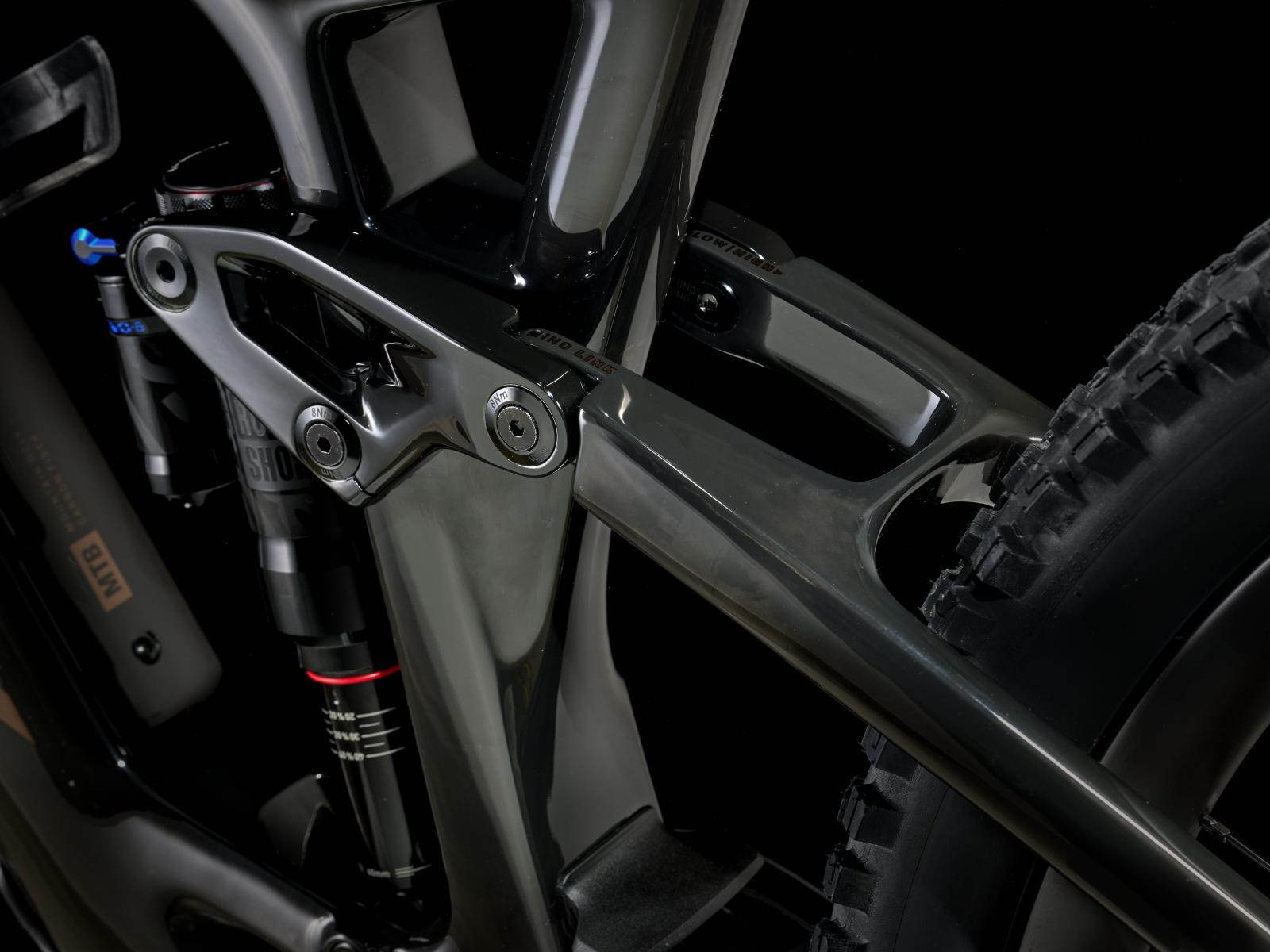 Rahmen: OCLV Mountain Carbon, herausnehmbarer Akku, interne Zugführung, Aluminiumumlenkhebel, 34,9 mm Sitzrohrdurchmesser, Aufnahme für obere Kettenführung, 55 mm Kettenlinie, Mino Link, ABP, Boost148, UDH, 140 mm Federweg
