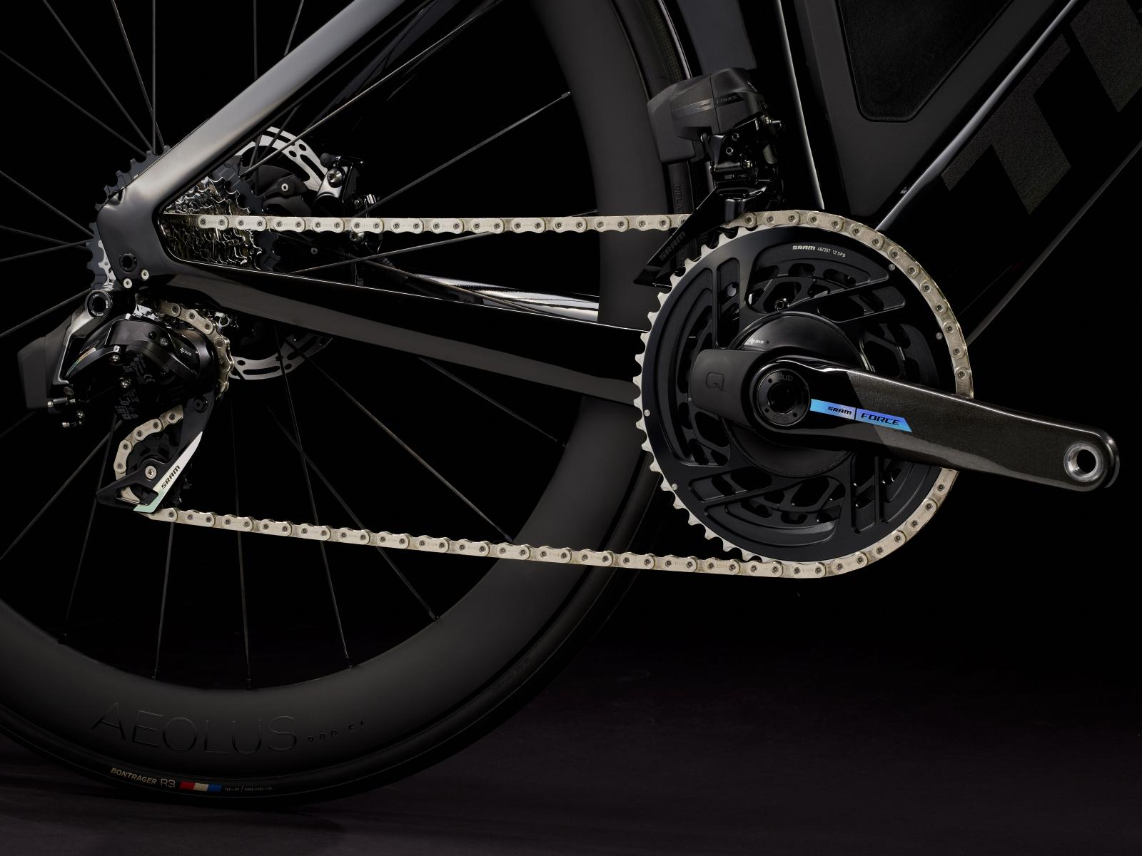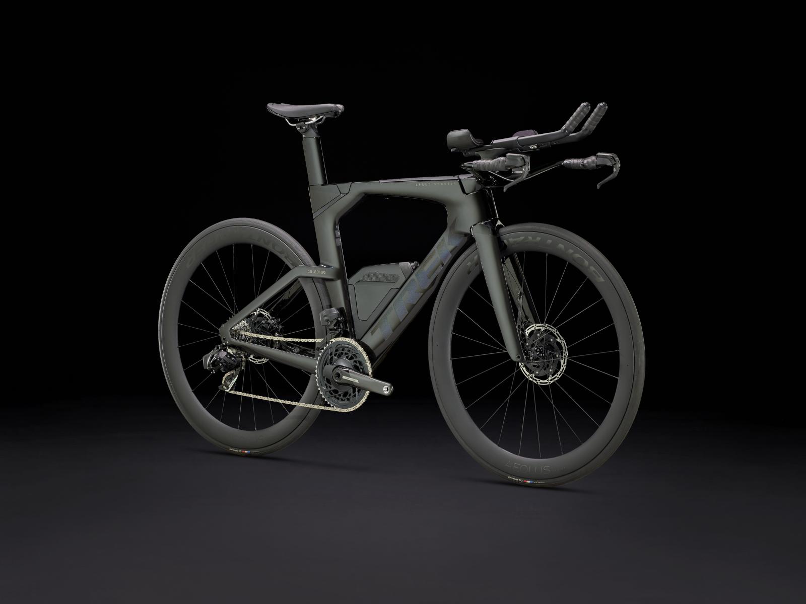 Einen ultraleichten Rahmen aus 800 Series OCLV Carbon, windschnittige Rohre mit Kammtail Virtual Foil-Profil (KVF), eine Speed Concept-Carbongabel mit aerodynamischem Profil, vibrationsdämpfendes IsoSpeed, integrierte Aufbewahrungslösungen für Verpflegung, Flüssigkeit und Pannenkit, einen drahtlosen, elektronischen SRAM Force AXS D2 12fach-Antrieb mit SRAM AXS Clics-Schalthebeln, einen SRAM Force AXS-Powermeter, einen vollständig integrierten Lenker samt Vorbau, einen triathlonspezifischen Bontrager Hilo Comp-Sattel für eine aggressive Aero-Sitzposition, Scheibenbremsen für zuverlässige Bremsleistung und Bontrager Aeolus Pro 51-